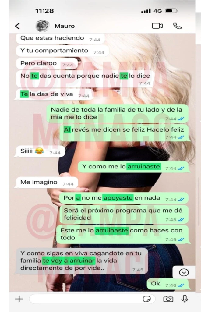 Ante esto, Icardi respondía diciendo: "Y como sigas en viva cag... en tu familia, te voy a arruinar la vida directamente de por vida...". En otra de las capturas compartidas por Pampa Mónaco se lee al deportista diciendo: "Y encima con mentiras como hiciste... No te preocupes, que como te creés viva ahora te voy a arruinar yo haciendo notas y diciendo las cosas. No te preocupes, ya verás".