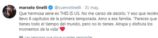 Si bien, cientos de miles de personas en el mundo se han apasionado con esta historia dramática, dos celebridades argentinas han demostrado su fanatismo en reiteradas ocasiones. Tal es el caso del conductor Marcelo Tinelli que suele twitear, compartir fotos de los personajes y frases en sus historias de Instagram.