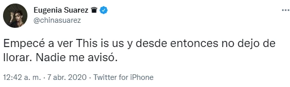 También se sumó al fanatismo la actriz China Suárez que comenzó a ver la serie en pleno confinamiento sanitario por la pandemia del coronavirus. La actriz twitteó: "Empecé a ver This is Us y desde entonces no dejo de llorar. Nadie me avisó".