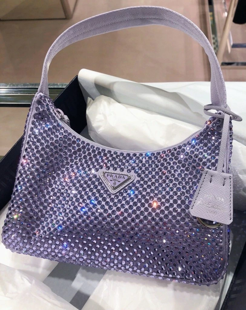 Este es el caso del mini bolso Prada con cristales que lució en una de sus tantas salidas nocturas por las atracciones madrileñas. Se trata del modelo re-edición 2000, en color púrpura y hecho con satén e incrustaciones de cristales en su exterior.