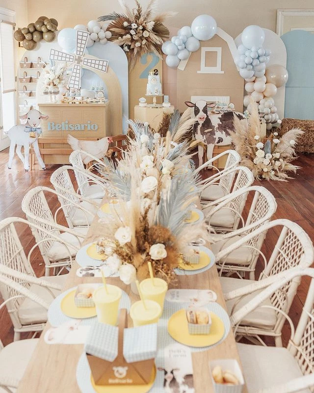 La celebración se destacó por su bella decoración con temática de granja. Predominaron los tonos tierra y diferentes matices de gris, así como el celeste pastel. Dentro de la casa de Juana recrearon un molinillo de viento, un granero y se sumaron vacas y ovejas.