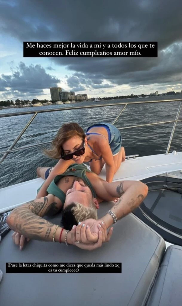 Luego, divertido, aclaró: "Puse la letra más chiquita como dices que queda más lindo porque es tu cumple". El mensaje lo escribió sobre una tierna postal de ambos mirándose sonrientes sobre un yate con una vista paradisíaca de Miami.