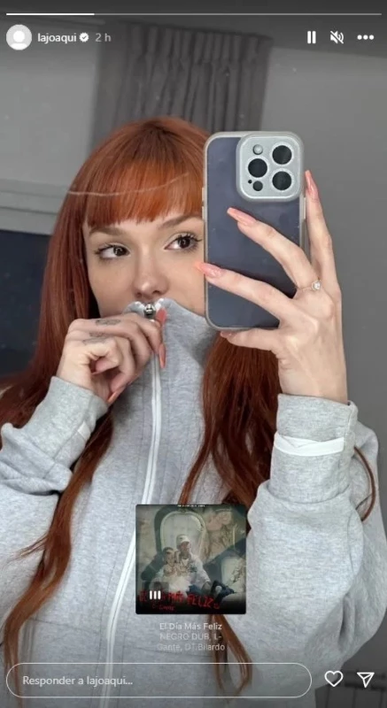 En sus historias de Instagram no habló en absoluto, sino que se limitó a postear esa selfie en el espejo, con una campera gris. De todos modos, dejó su mensaje bien claro: avala a su amigo L-Gante (23), ya que posteó su último lanzamiento, "El día más feliz".