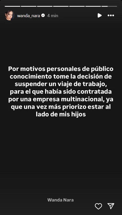 El anuncio lo hizo a través de sus historias de Instagram, donde compartió un mensaje con letras blancas y fondo negro. "Por motivos personales de público conocimiento tomé la decisión de suspender un viaje de trabajo, para el que había sido contratada por una empresa multinacional", confirmó la empresaria.