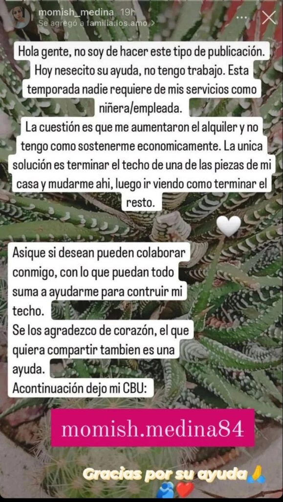 Esta semana Momish había publicado ante sus 35 mil seguidores de Instagram: "Hola, gente, no soy de hacer este tipo de de publicación. Hoy necesito su ayuda: no tengo trabajo. Esta temporada nadie requiere de mis servicios como niñera/empleada".
