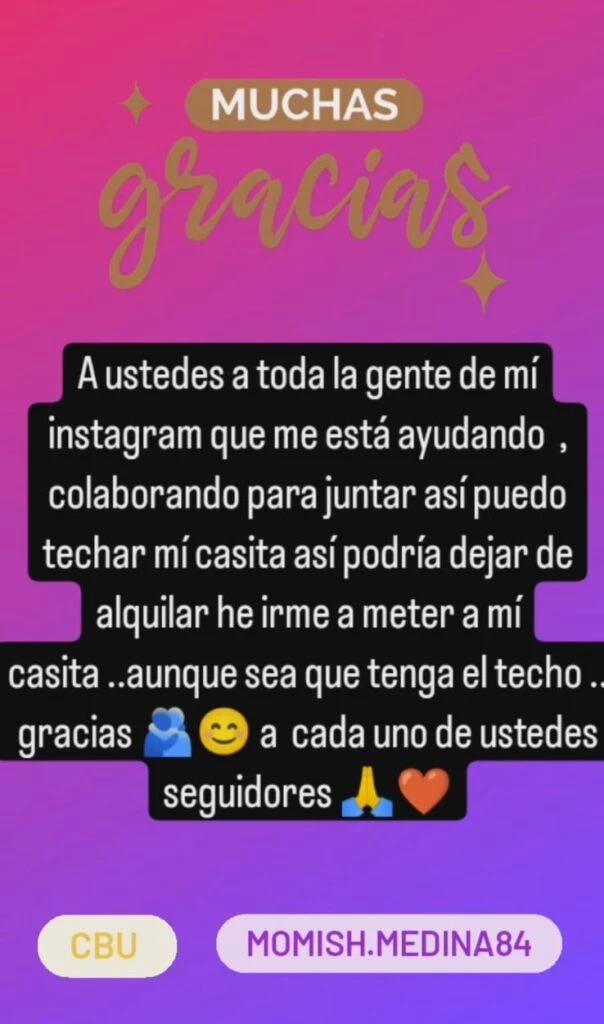 "Muchas gracias a toda la gente de mi Instagram que me esta ayudando y colaborando para poder techar mi casita. Así podría dejar de alquilar e irme ahí", cerró.