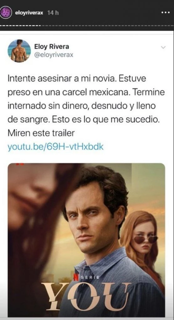 En ese momento, fue el mismo el que contó en sus redes sociales lo que había hecho, y se comparó con el protagonista de la serie You, un psicópata y asesino. "Intenté asesinar a mi novia. Estuve preso en una cárcel mexicana. Terminé internado sin dinero, desnudo y lleno de sangre. Esto es lo que me sucedió. Miren este tráiler", señaló de manera cínica.