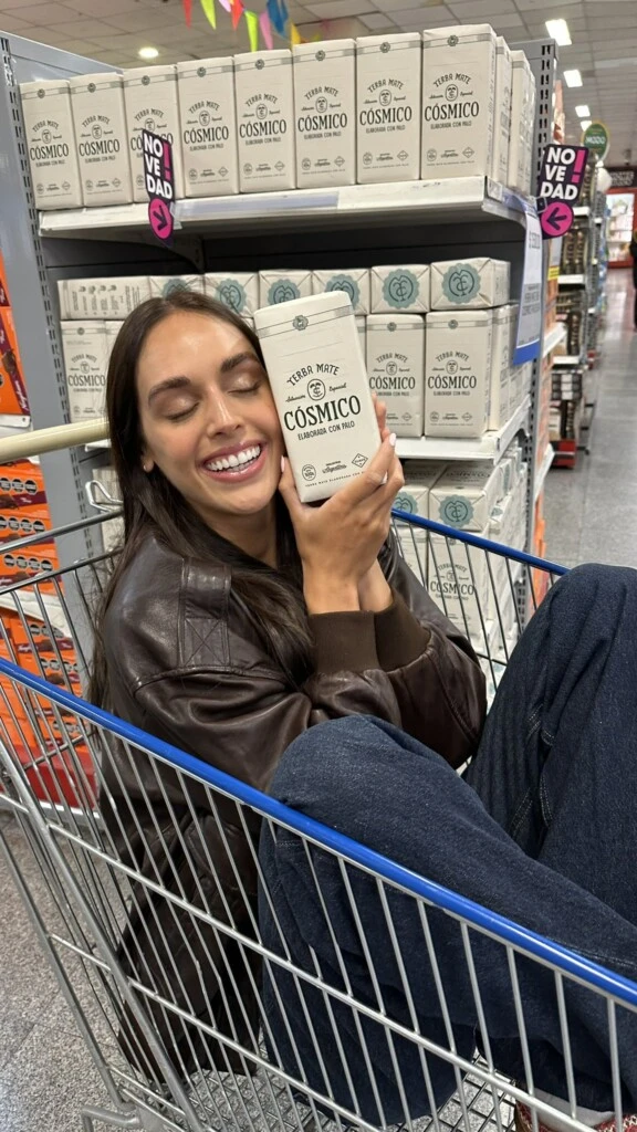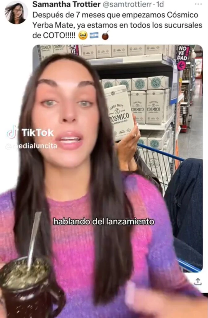 En el video de 56 segundos se la puede ver tomando mate a cámara y decir: "Ayer puse un tuit que se hizo viral. Estaba hablando del lanzamiento de nuestra marca de yerba mate que se llama Cósmico que recién se lanzó en todas las sucursales de una gran cadena de supermercados".