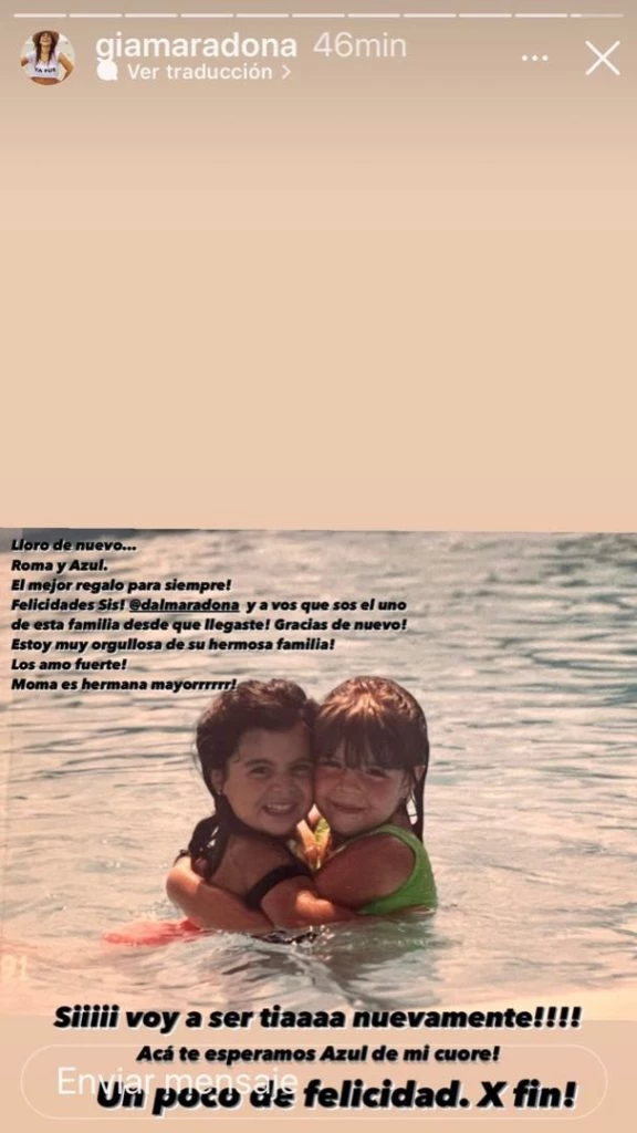 La responsable de confirmar la noticia no fue la hija mayor de Diego Maradona, si no su hermana Gianinna. "Lloro de nuevo: Roma y Azul. El mejor regalo para siempre!! Felicidades sis!!! @dalmamaradona", escribió Giannina en su cuenta de Instagram y subió una foto de ella y su hermana a los 2 y 4 años.