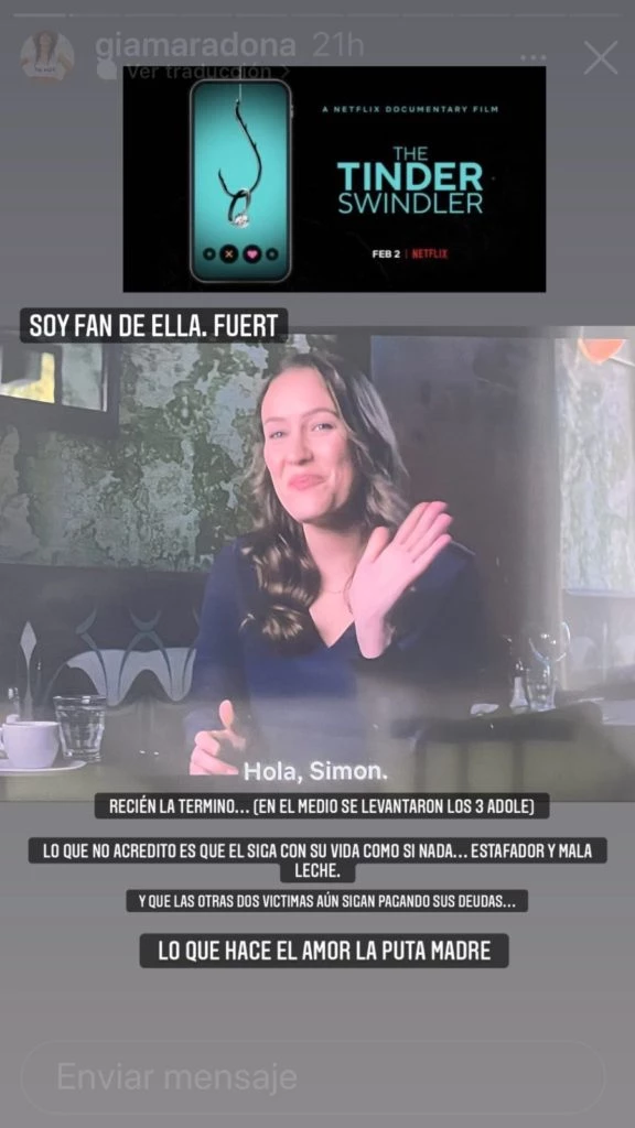 En una siguiente historia muy peculiar Gianinna Maradona incluso llegó a lanzar un guiño sobre que su ex pareja tendría un parecido al timador de Tinder, Shimon Hayut, del cual se hizo conocida su historia el último fin de semana con el lanzamiento del documental de Netflix, The Tinder Swindler. En donde las mujeres al cual el hombre estafó cuentan sus padecimientos.