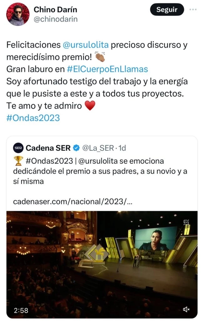 Por su parte, el actor argentino no se quedó atrás y utilizó sus redes para demostrar el orgullo y la admiración que siente por su pareja, con quien sostienen una relación de siete años. "Felicitaciones @ursulolita. Precioso discurso y merecidísimo premio. Gran laburo en #ElCuerpoEnLlamas Soy afortunado testigo del trabajo y la energía que le pusiste a éste y a todos tus proyectos. Te amo y te admiro".
