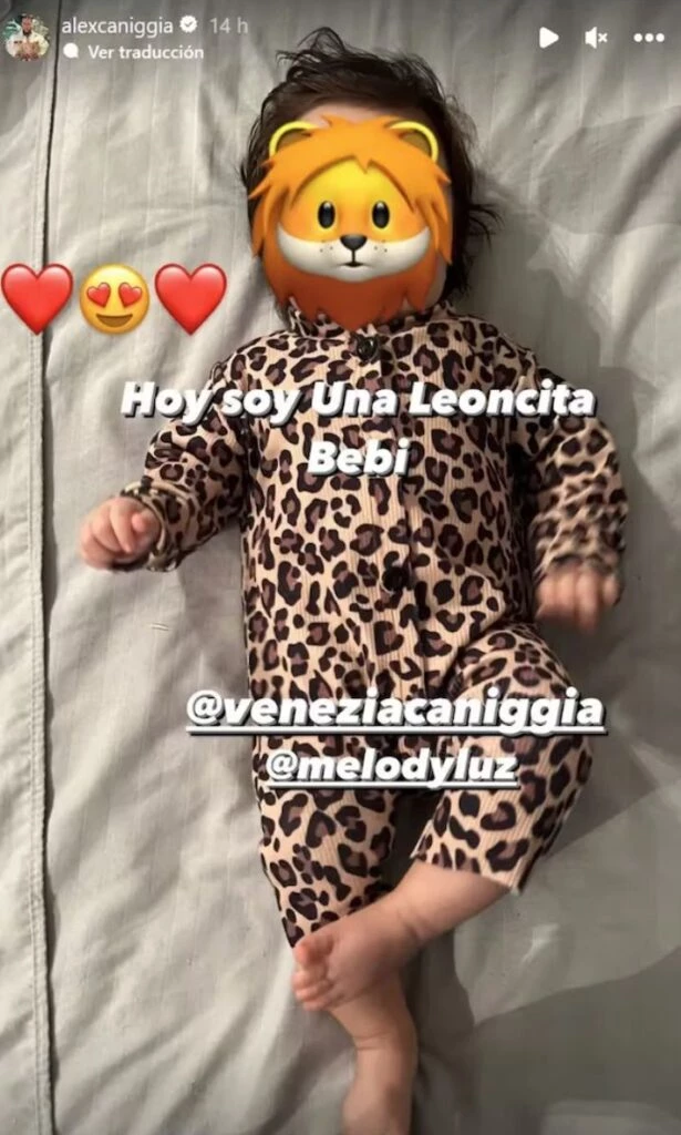 "Hola, soy una leoncita bebi", escribió Alex Caniggia con muchísimo orgullo. En la imagen se puede ver a su hija con un hermoso body animal print. Por supuesto le taparon su carita con un emoji de león.