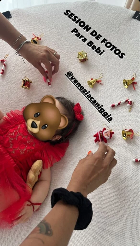 Alex también adelantó una sesión fotográfica que realizó con su primogénita. Para esta ocasión la vistió con un vestido rojo con encaje y volados de tul. A su alrededor ubicaron decoración navideña como campanitas y pequeños papá noel.