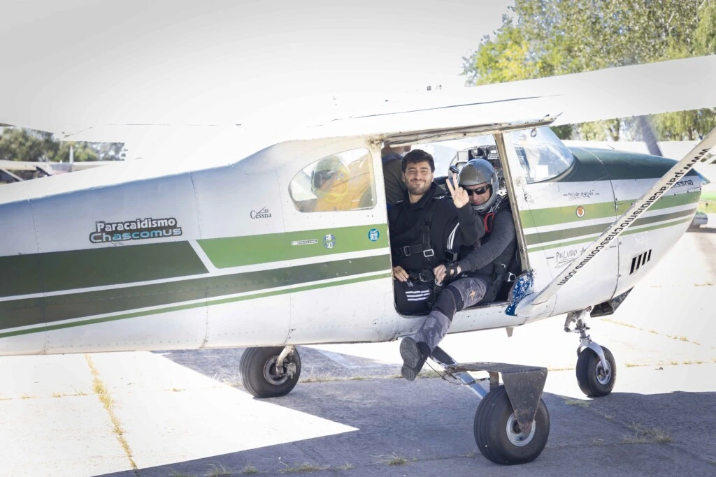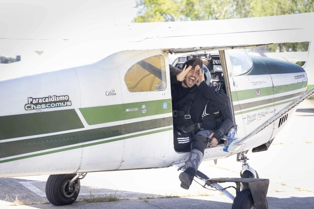 Bajo un sol espectacular y una temperatura ideal, Ponce recibió las instrucciones pertinentes del lugar para vivir una experiencia a pura adrenalina y emoción, a metros del suelo. Todo comenzó al subir al avión: el mismo despega de la pista del aeródromo de Chascomús y vuela durante 20 minutos hasta llegar a la altura del salto.