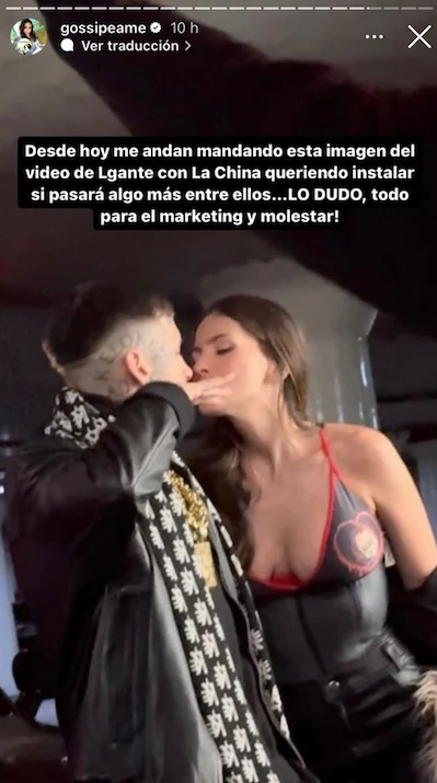 En este contexto, Pochi de Gossipeame compartió una imagen del videoclip de L-Gante y la China, en la que parece que se están dando un beso. "Desde hoy me andan mandando esta imagen del video de L-Gante con la China queriendo instalar si pasara algo más entre ellos... Lo dudo, todo para el marketing y molestar", comentó la panelista.