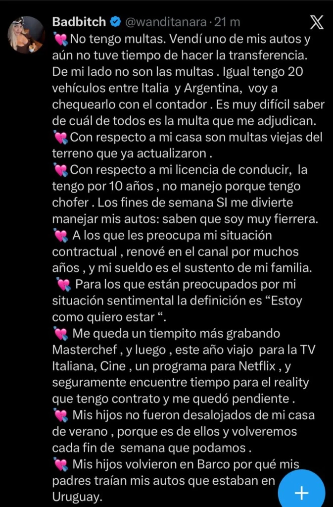Otro de los puntos que quiso aclarar fue su situación laboral. Frente a rumores de conflicto con Telefe, Wanda fue clara: “A los que les preocupa mi situación contractual, renové en el canal por muchos años, y mi sueldo es el sustento de mi familia”, escribió, cerrando cualquier especulación sobre su continuidad en la pantalla.