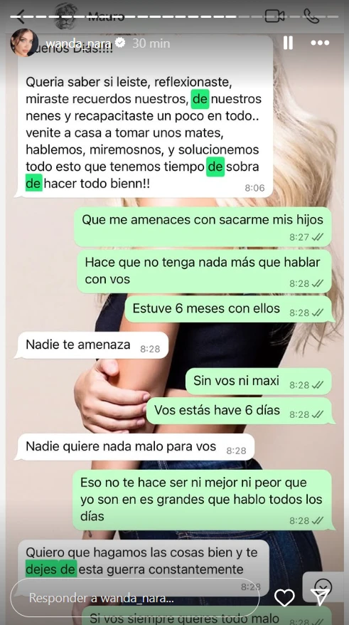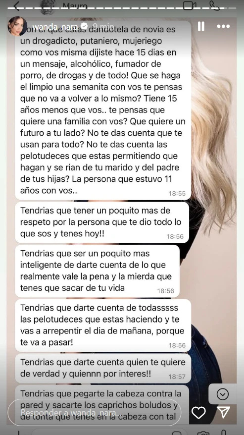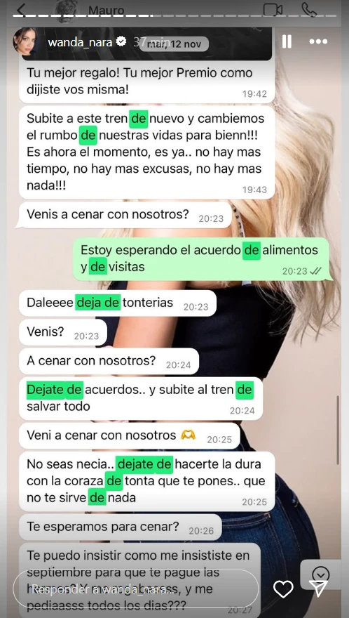 Las historias continuaron con más conversaciones de textos realizadas en los últimos días. En casi todas, se puede leer que Mauro quiere volver a toda costa con Wanda, en tanto ella le remarca una y otra vez que su felicidad ya no está al lado suyo.