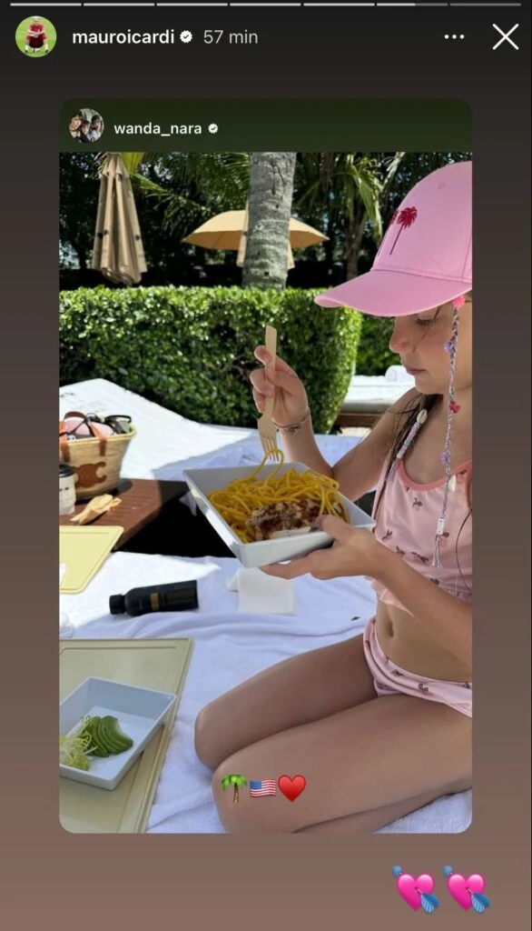 Además Mauro compartió una historia de Instagram en la que Wanda Nara lo había etiquetado. En esa publicación se ve a Isabella, su hija menor, comiendo un plato de fideos en el parador del hotel en el que se encuentran. Icardi le agregó dos emojis de corazón atravesados por una flecha a esa divertida postal de su hija menor en Miami.