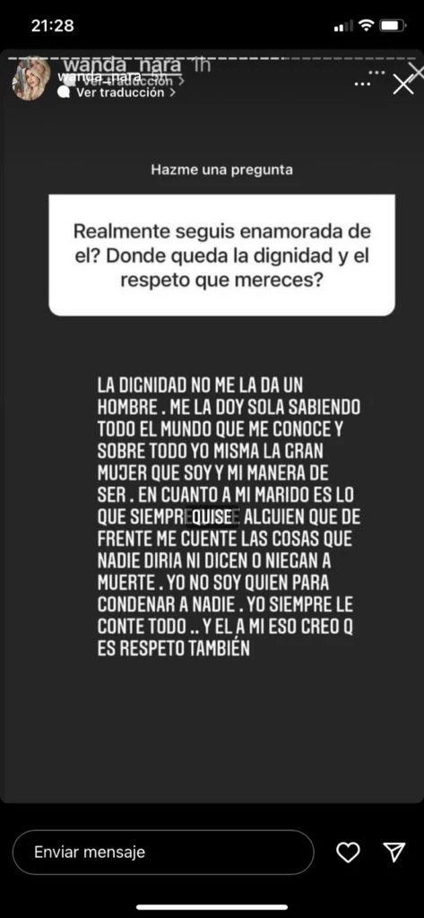 Wanda fue fuertemente indagada sobre porqué había perdonado a su marido luego del Wandagate. Su contundente respuesta fue: "Si no pasa no es y si te lo cuentan es arrepentimiento", y continuó: "Creo en la palabra, en el perdón y en el arrepentimiento".