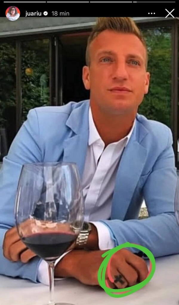A su vez, para confirmar que la mano de la foto era la de López, Juariu compartió una imagen en la que se lo ve a él sentado, con un traje celeste y tomando una copa de vino. El detalle que remarcó es que en su mano derecha tiene un tatuaje de una cruz, al igual que en la mano que se ve en la historia que subió Wanda.