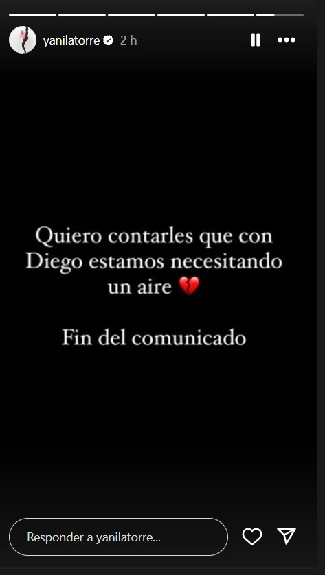 En detalle, la panelista de LAM (América) compartió en una historia un mensaje junto a un emoji de un corazón roto que decía: "Quiero contarles que con Diego estamos necesitando un aire. Fin del comunicado".