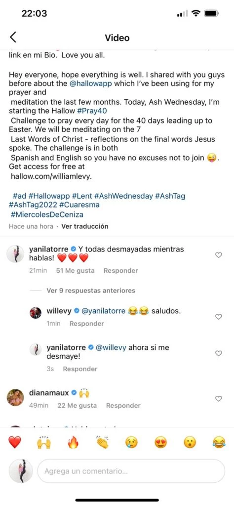 “Hola mi gente!! Espero estén bien. Ya había compartido con ustedes anteriormente sobre @hallowapp y cómo la he utilizado para orar y meditar en los meses recientes. Hoy, Miércoles de Ceniza, estoyiniciando el reto #Cuaresma2022 para orar todos los días hasta el Domingo de Pascua”, comenzó diciendo William Levy.