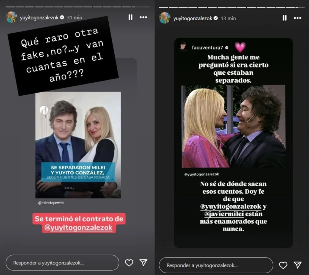 Allí fue que la ex vedette aprovechó a hacer frente a las versiones de crisis de pareja que afrontan por estos días. En una historia de Instagram, ante sus más de 133 mil seguidores, Yuyito mostró una noticia titulada: “Se separaron Milei y Yuyito González según fuentes de la Casa Rosada”, y le agregó encima: “Qué raro otra fake, no?... y van cuántas en el año?”