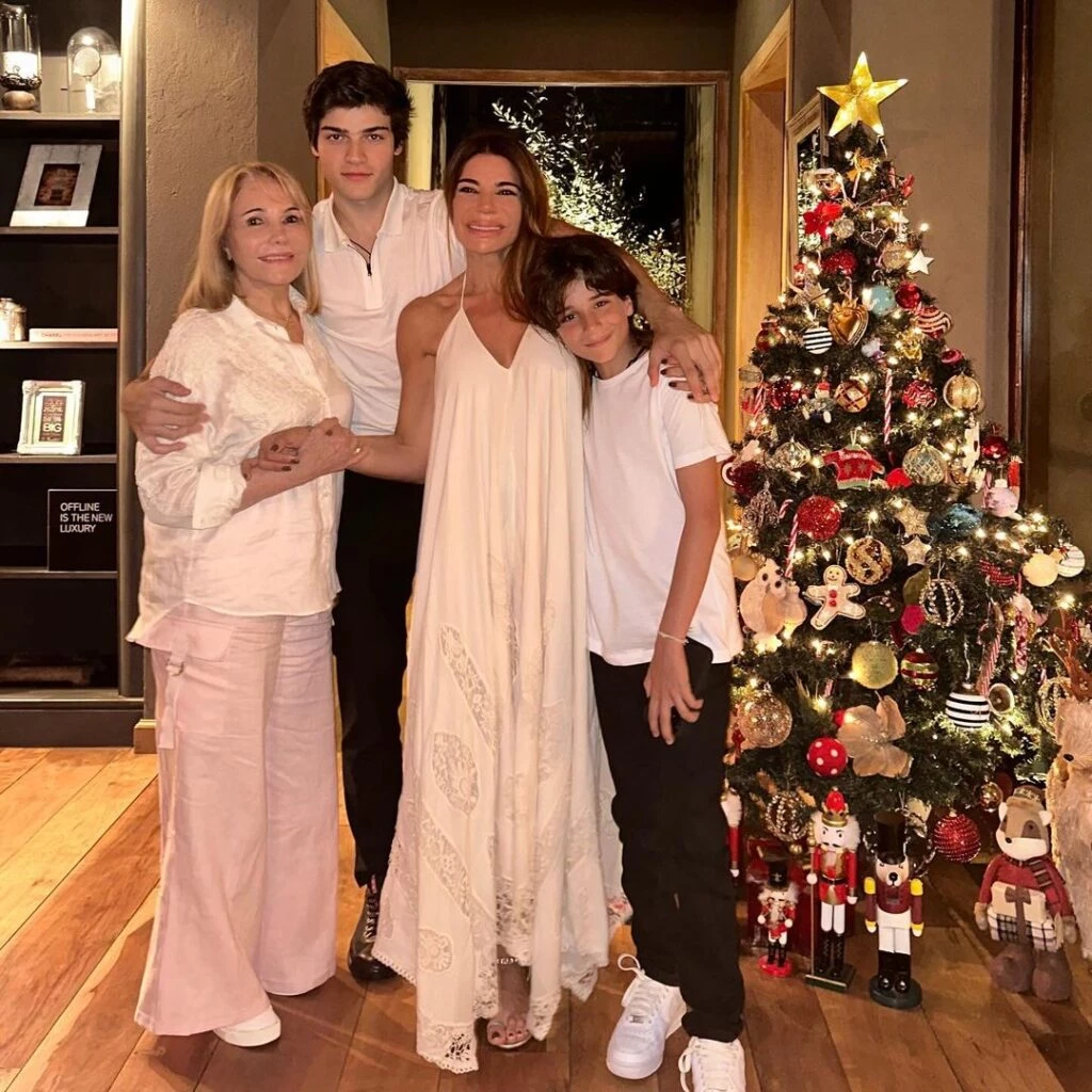 En la foto compartida por la empresaria se la puede ver sonriente junto a su mamá Zulema Yoma y sus hijos Luca Bertoldi y Malek Pocoví. Los cuatro posaron junto al luminoso árbol de navidad muy sonrientes y con el mismo dress code: total white.
