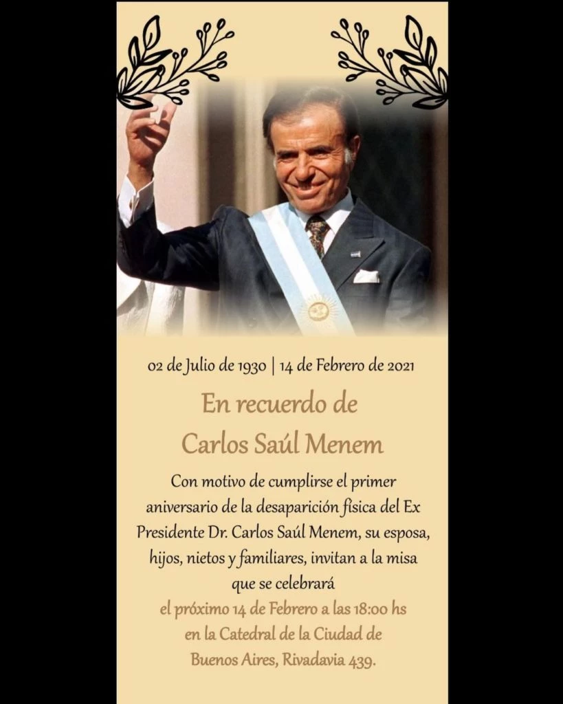 El próximo 14 de febrero la familia Menem también convocó a una misa en su honor. “Con motivo de cumplirse el primer aniversario de la desaparición física del ex Presidente, Dr. Carlos Saúl Menem, su esposa, hijos, nietos y familiares, invitan a la misa que se celebrará el próximo 14 de febrero a las 18 horas en la Catedral de la Ciudad de Buenos Aires, Rivadavia 439”, expresa el comunicado dado a difundir por Zulema Menem.