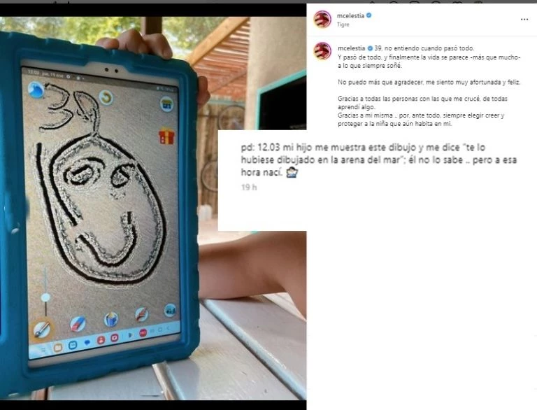"A las 12.03 mi hijo me muestra este dibujo y me dice “te lo hubiese dibujado en la arena del mar”, contó la artista con una foto del dibujo y añadió: "Él no lo sabe... pero a esa hora nací".