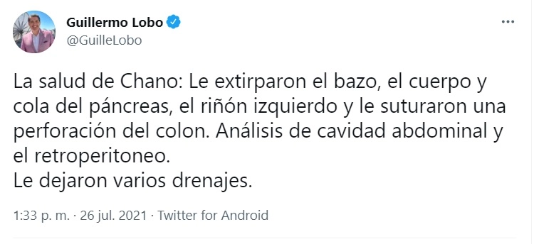 Chano sigue en terapia intensiva del Sanatorio Otamendi, donde se encuentra intubado mientras se recupera de la intervención quirúrgica. "Le extirparon el bazo, el cuerpo y cola del páncreas, el riñón izquierdo y le suturaron una perforación del colon. Análisis de cavidad abdominal y el retroperitoneo. Le dejaron varios drenajes", detalló Guillermo Lobo sobre el último parte médico del músico en Twitter.