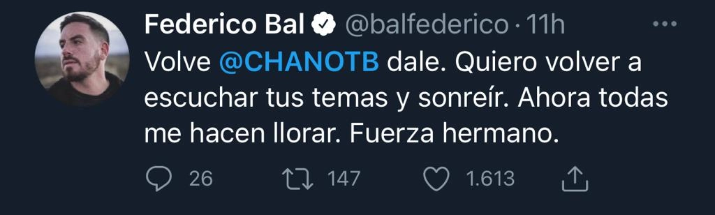 Con más de 25 mil tweets, el intérprete de Ciudad mágica es de lo más mencionado en la red creada por Jack Dorsey. Entre los miles de mensajes y expresiones de aliento para Chano y su familia, se destaca el posteo que hizo su amigo Fede Bal.
