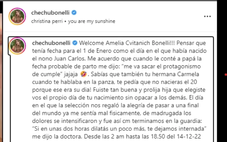 Chechu relató: "El día en el que la Selección nos regaló la alegría de pasar a una final del mundo ya me sentía mal físicamente, de madrugada los dolores se intensificaron y fue así como terminamos en la guardia: 'Si en unas dos horas dilatás un poco más, te dejamos internada' me dijo la doctora".
