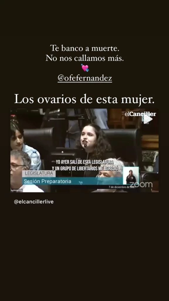 Compartiendo el video en el que Ofelia Fernández expresó su descargo frente al nuevo legislador liberal, la China Suárez mostró su apoyo diciendo: “Te banco a muerte. No nos callamos más. @ofefernandez Los ovarios de esta mujer”.