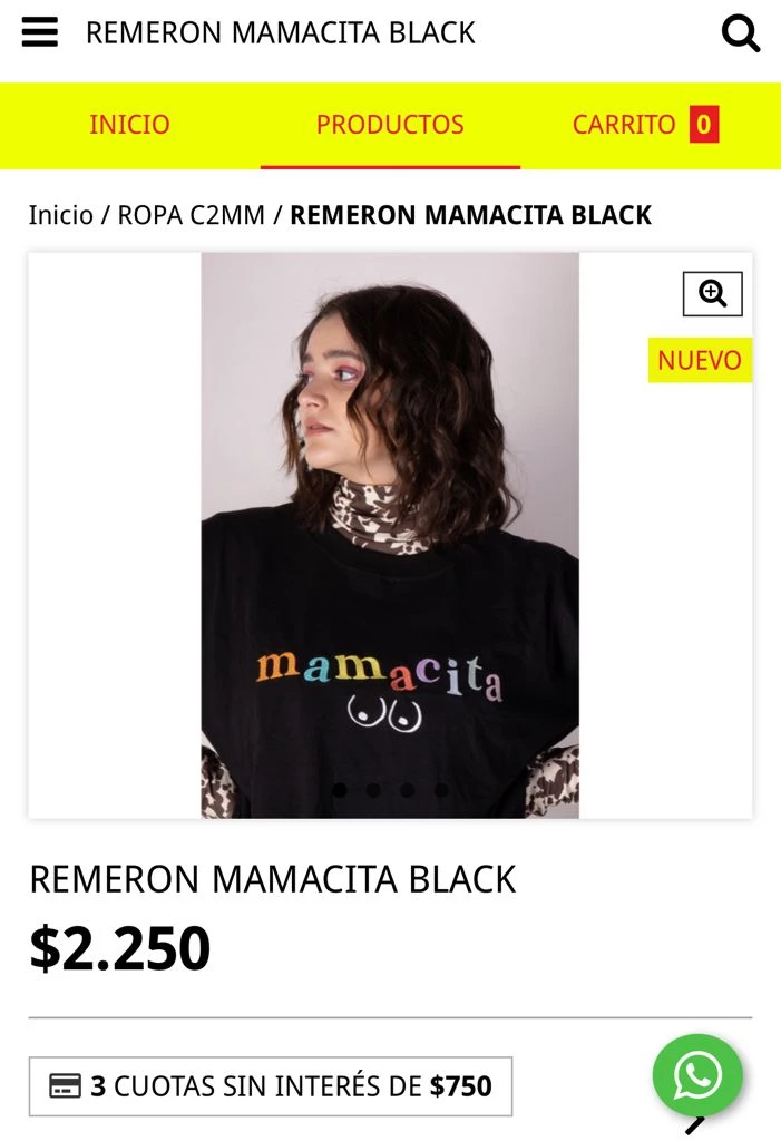 La remera negra con coloridas letras que forman la palabra mamacita y rematan una suerte de senos se consigue en la tienda oficial de Comme to Mama a 2250 pesos.