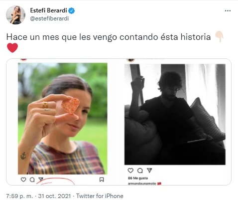 "Hace un mes que lo vengo diciendo", escribió Berardi junto a dos capturas donde se veía un posteo de la China posando con un galleta en forma de corazón y el like de 'armando una moto', la cuenta de Armando, y la segunda publicación se lo puede ver a él en blanco y negro, y junto a la imagen compartió una bandera de China.