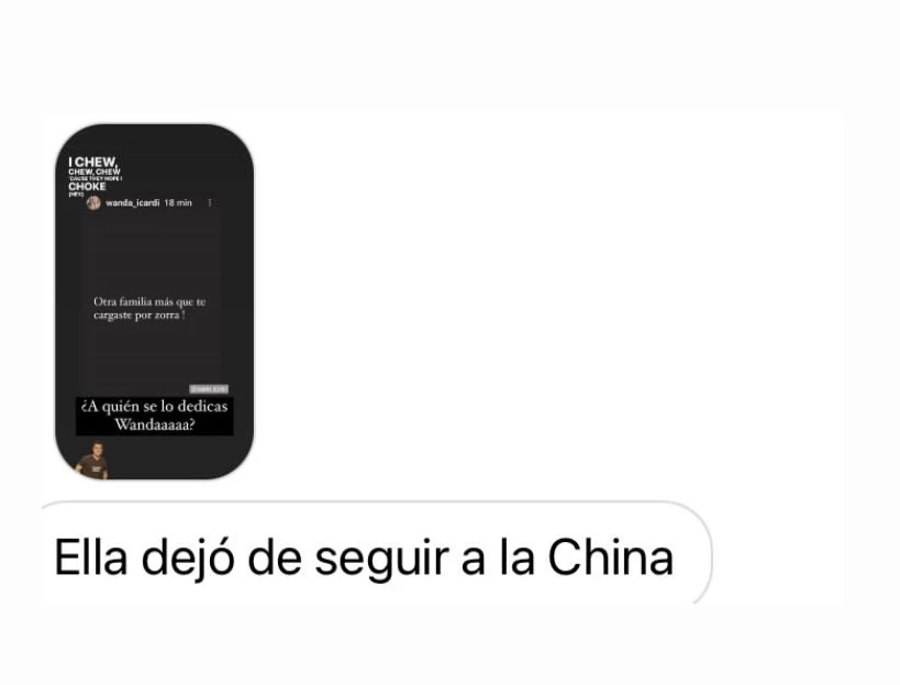 Luego brindó su opinión al respecto: "¡Qué necesidad con tantos hombres solteros! Feo todo". Acto seguido, compartió una captura de un mensaje que le llegó por parte de un seguidor. "Ella dejó de seguir a la China". Asimismo, compartió otro donde se leía: "Wanda borró todos sus fotos con Icardi y dejó de seguir a la China".