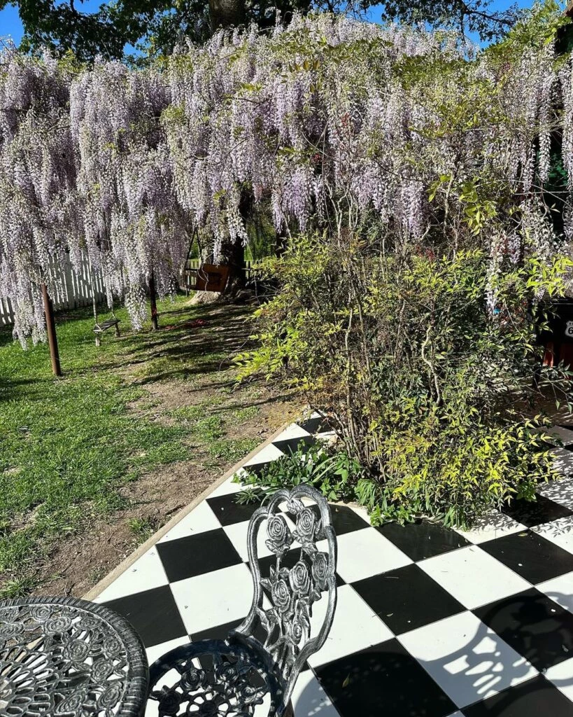 La China aprovechó a full esta día soleado para disfrutar del aire libre. Uno de sus sectores preferidos es la galería que da al parque. Se destaca por sus baldosas antiguas blanco y negro. Para disfrutar del sol sumó una mesa con sillas de hierro con vista a la espectacular enredadera lila llamada Glicina.