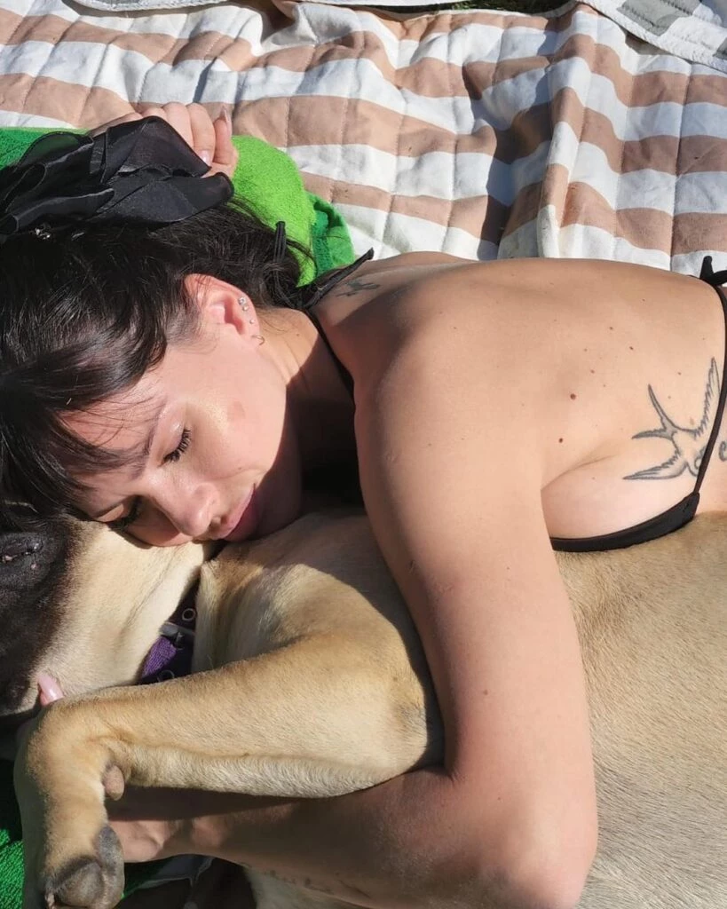 Durante este sábado espectacular, la actriz armó un mini picnic en el parque. Tan solo con una manta y en bikini aprovechó al 100% del sol y del cariño de su perro bulldog francés.