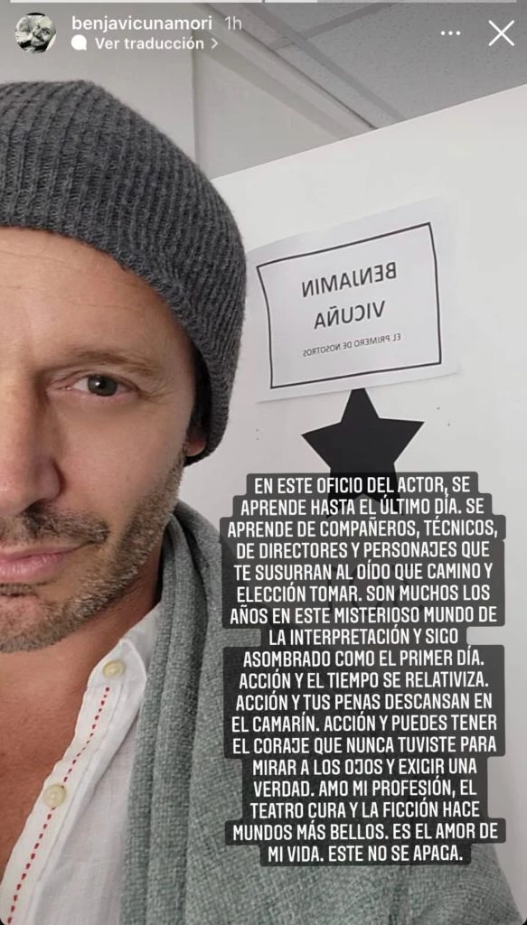Ahora, Vicuña dio una contundente señal al postear una reflexión sobre el importante lugar que ocupa la actuación en su vida en donde incluyó una clara indirecta para su expareja. “En este oficio del actor se aprende hasta el último día. Se aprende con compañeros, técnicos, de directores y personajes que te susurran al oído que camino y elección tomar. Son muchos los años en este misterioso mundo de la interpretación y sigo asombrado como el primer día”, señaló en la primera parte de su descargo.
