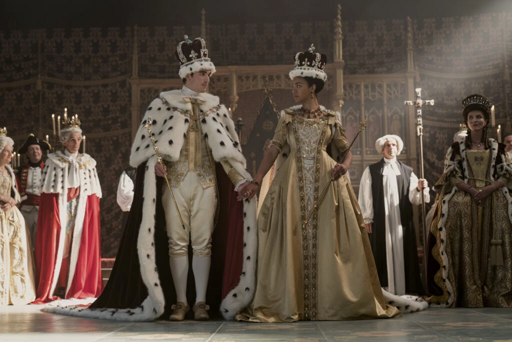 RHIMES: Lo que amo de esa relación es que llegas a ver cómo se forma esa maravillosa dinámica entre la joven Charlotte y la joven Agatha, que, en algún momento, se convertirá en lady Danbury. Pasas de verlas como gentiles extrañas a amigas cercanas, a genuinas confidentes. Y, en el proceso, también llegas a ver cómo Charlotte ocupa su rol de reina y levanta una barrera entre ella y el mundo exterior, algo que tiene que suceder para que ella se convierta en realeza. Y realmente comprendes las diferencias de clase. Y las diferencias raciales me resultaban muy importantes y familiares, y quería mostrar eso. Obviamente, Inglaterra no estaba en ese lugar en ese momento, no tan específicamente, pero realmente quería explorar cómo hubiera sido pasar de cero a sesenta en lo que a una sociedad integrada respecta.