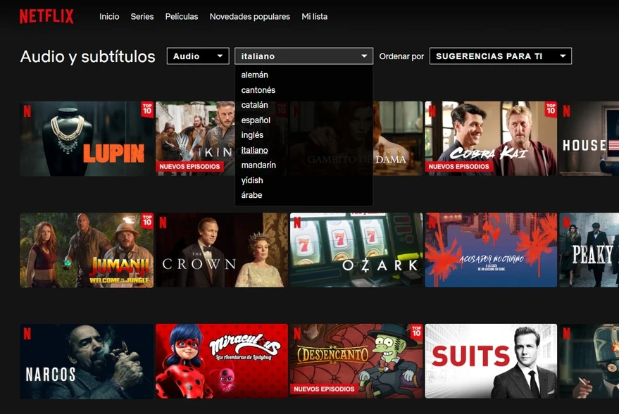 Una vez realizada esta modificación, como se puede observar en la imagen anterior, tendrás toda la plataforma en el idioma elegido para mejorar tu nivel, tanto oral como escrito, ya que aparecerán las palabras que se encontraban antes pero en la lengua que hayas seleccionado, y podrás disfrutar de tu serie favorita en el idioma que quieras.