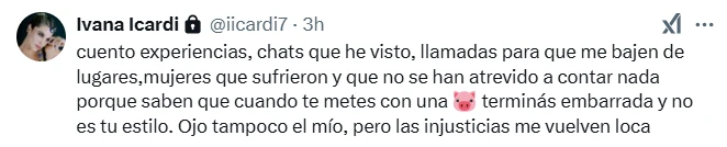 Ante la gran cantidad de mensajes, preguntas y cuestionamientos a sus dichos, la ex participante de Gran Hermano sumó: "Cuento experiencias, chats que he visto, llamadas para que me bajen de lugares, mujeres que sufrieron y que no se han atrevido a contar nada porque saben que cuando te metés con una cerda terminás embarrada y no es tu estilo. Ojo tampoco el mío, pero las injusticias me vuelven loca...".