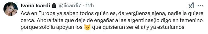 "Acá en Europa ya saben todos quién es, da vergüenza ajena, nadie la quiere cerca. Ahora falta que deje de engañar a las argentinas (lo digo en femenino porque solo la apoyan los gatos que quisieran ser ella) y ya estaríamos", fue el primer y letal mensaje que Ivana escribió en sus redes.
