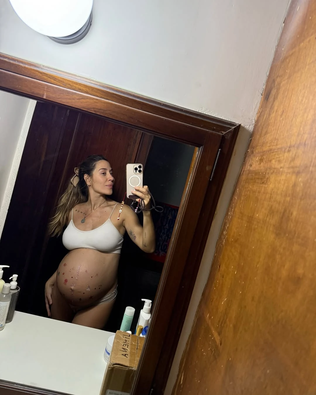 “Queda poca panza, comienza la recta final, bien cargadita de emociones. Llantos, ansiedades, rituales, meditaciones, siestas que más que siestas parecen desmayos a otra órbita, sueños raros, comidas caseras, la casa preciosa, mucho amor, flores, culpas, miedos, familia, cumpleaños en unos días, hombres que marcan territorio, otro adentro que patea tanto que tuve que avisarle que tiene que esperar un poco más, por las dudas salga demasiado fuerte y ansioso como el papá”, dijo describiendo las emociones que la atraviesan tanto a ella como a su pareja y su hijo mayor.