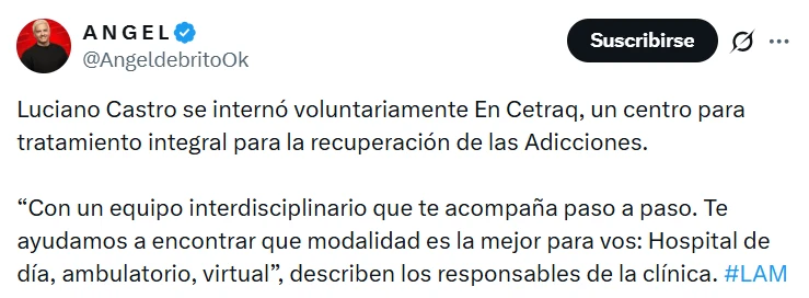 Luciano Castro decidió dar un paso importante para su bienestar personal y se internó de manera voluntaria en Cetraq, un centro dedicado al tratamiento integral de las adicciones ubicado en la Ciudad de Buenos Aires.