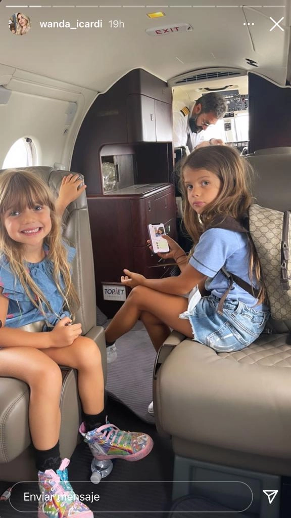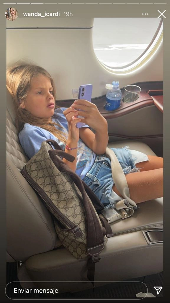 En el paneo que hizo Wanda a bordo del avión privado hubo otro detalle no menor. La mochila de su hija mayor. En una de las capturas que hicimos de sus stories se destaca la mochila firmada por Gucci. En la postal, descansa al lado de la pequeña mientras ella se entretiene con un IPhone.