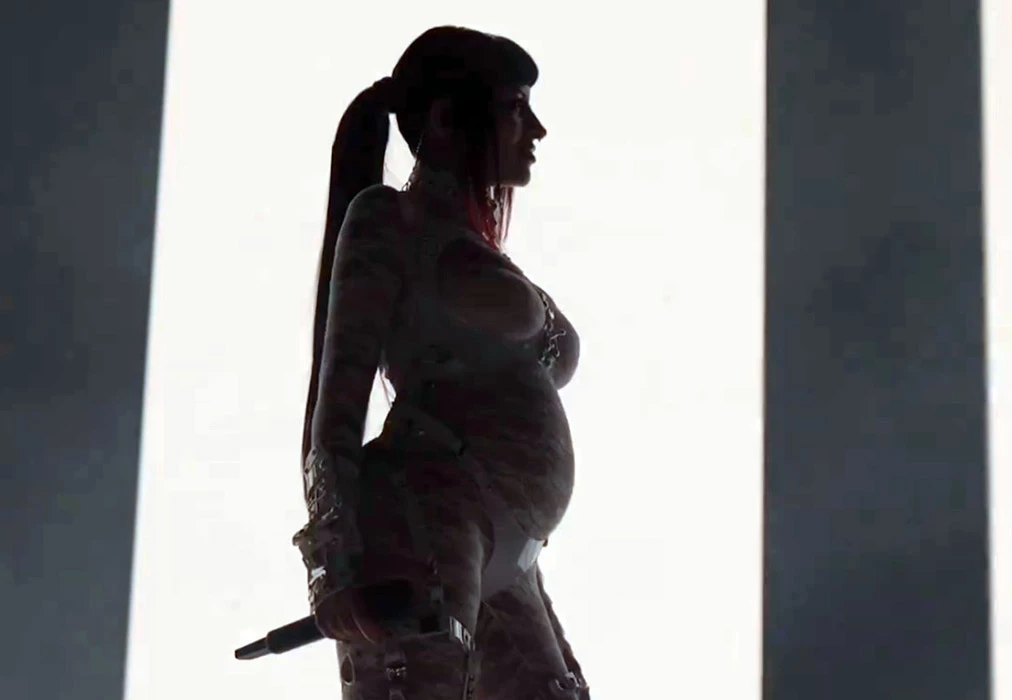 La cantante se mostró con un catsuit de encaje blanco con accesorios de cuero y tacos, mientras todos los fanáticos ponían sus teléfonos en alto para tomar las imágenes que confirmaban que iba a convertirse en madre.