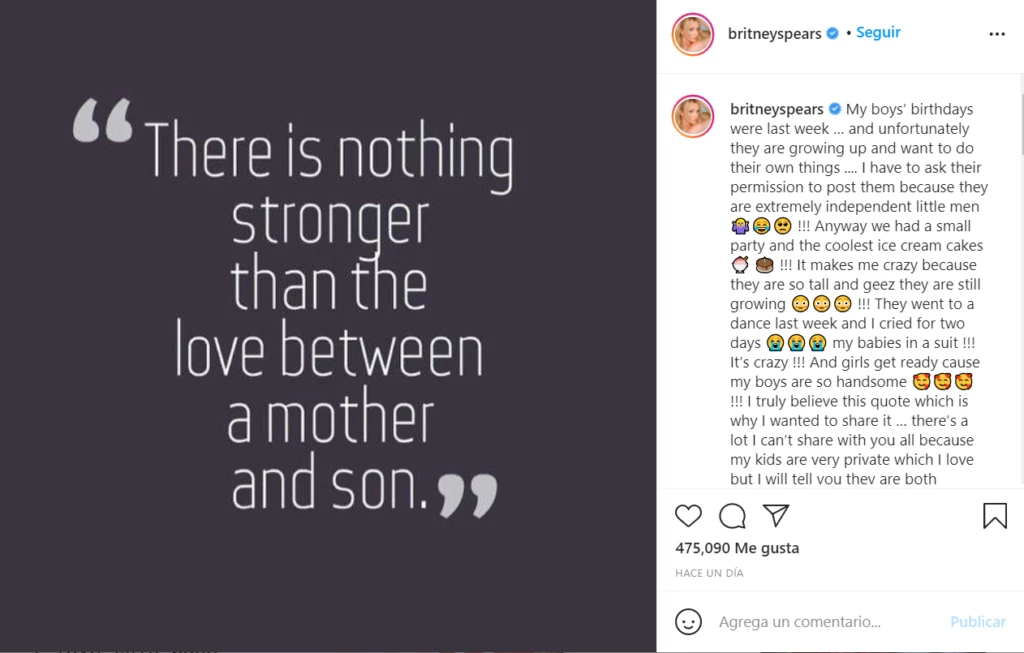 La princesa del pop realizó una emotiva publicación sobre sus hijos, aunque sin mostrar fotos y confesó que lloró mucho al darse cuenta cuánto han crecido sus “niños”. La imagen que acompaña el texto dice “No hay nada más fuerte que el amor de una mamá y su hijo".