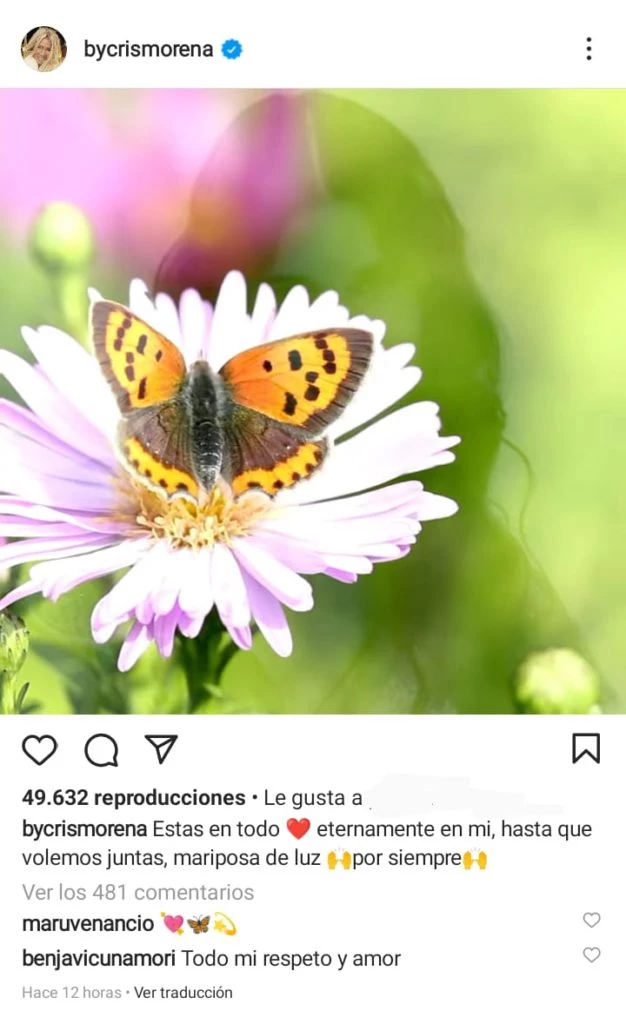 En la imagen compartida en Instagram se puede ver a una mariposa posada en una flor y de fondo se acerca el rostro de Romina. A los pocos minutos, su emotiva publicación cosechó miles de 'likes' y cientos de mensajes de parte de famosos que se emocionaron al leer las palabras que Cris le dedicó a su hija fallecida.